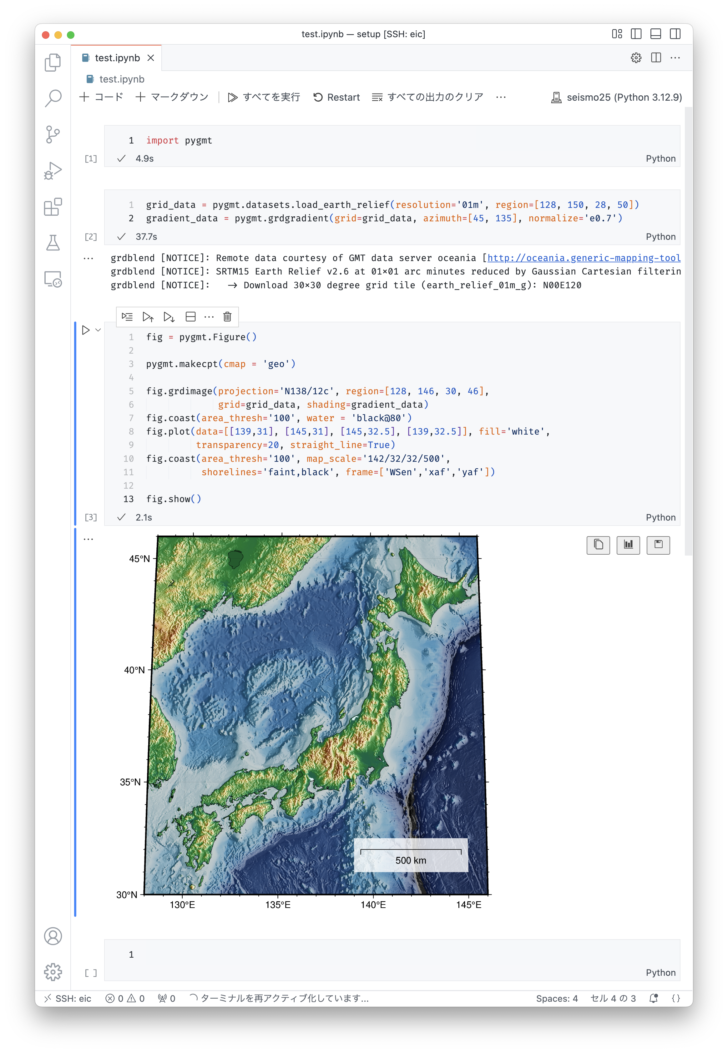 上図は,VSCodeでEICに接続し,そこで上述の環境でJupyter Notebookを利用し,PyGMTにより地図を描画したものです.このような環境を整備しておくと,EIC上実施した数値シミュレーションの可視化や事後解析をEIC上でそのまま実施できて,便利になることでしょう.